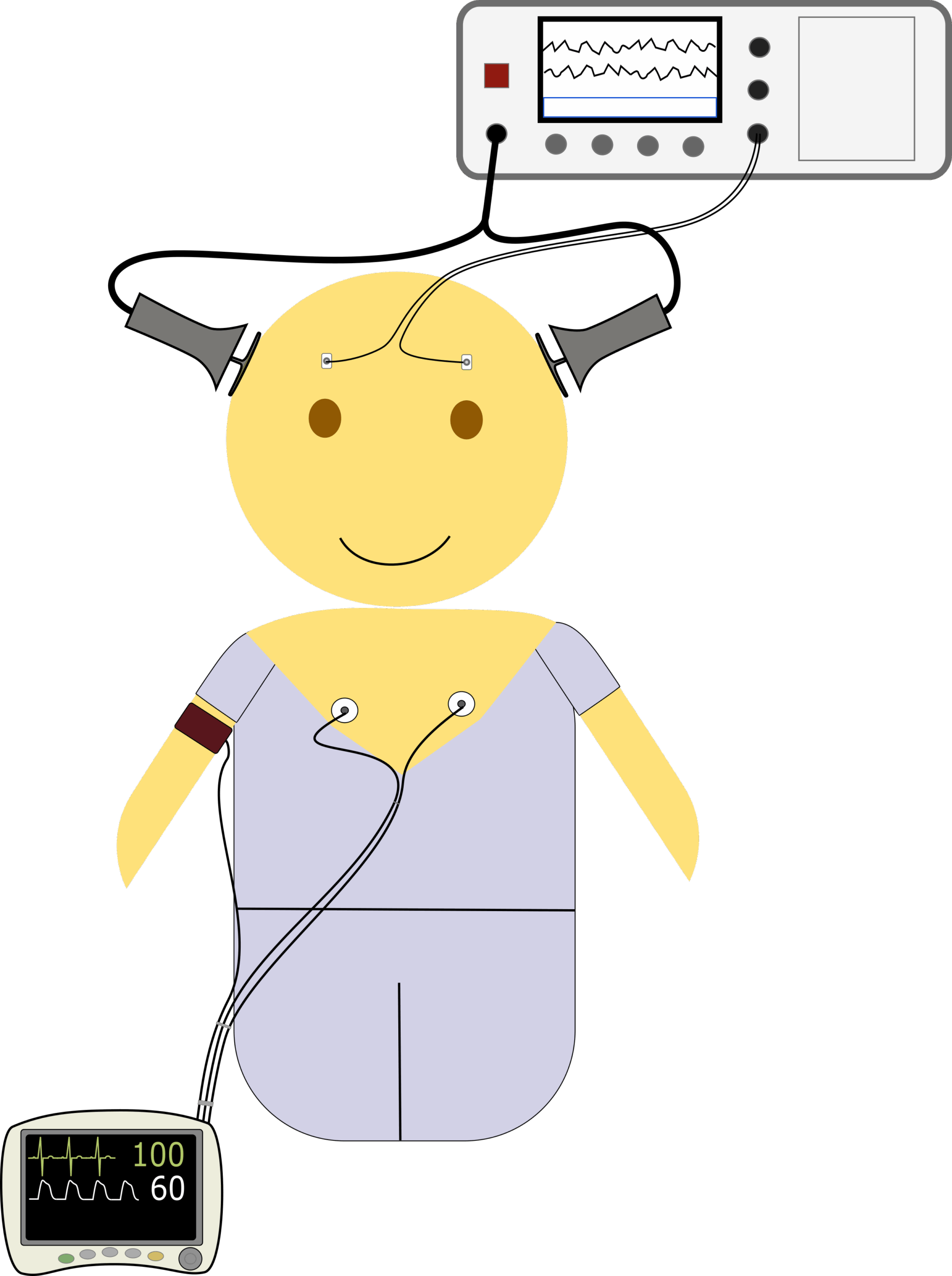 En haut, on voit le stimulateur ECT. C’est l’appareil qui permet de délivrer la stimulation . Il permet aussi au psychiatre de régler les paramètres de la stimulation. Il est équipé d’électrodes d’électroencéphalogramme (EEG) que l’on place sur le front et derrière les oreilles pour surveiller l’activité du cerveau en direct et s’assurer que la stimulation est la plus efficace possible.